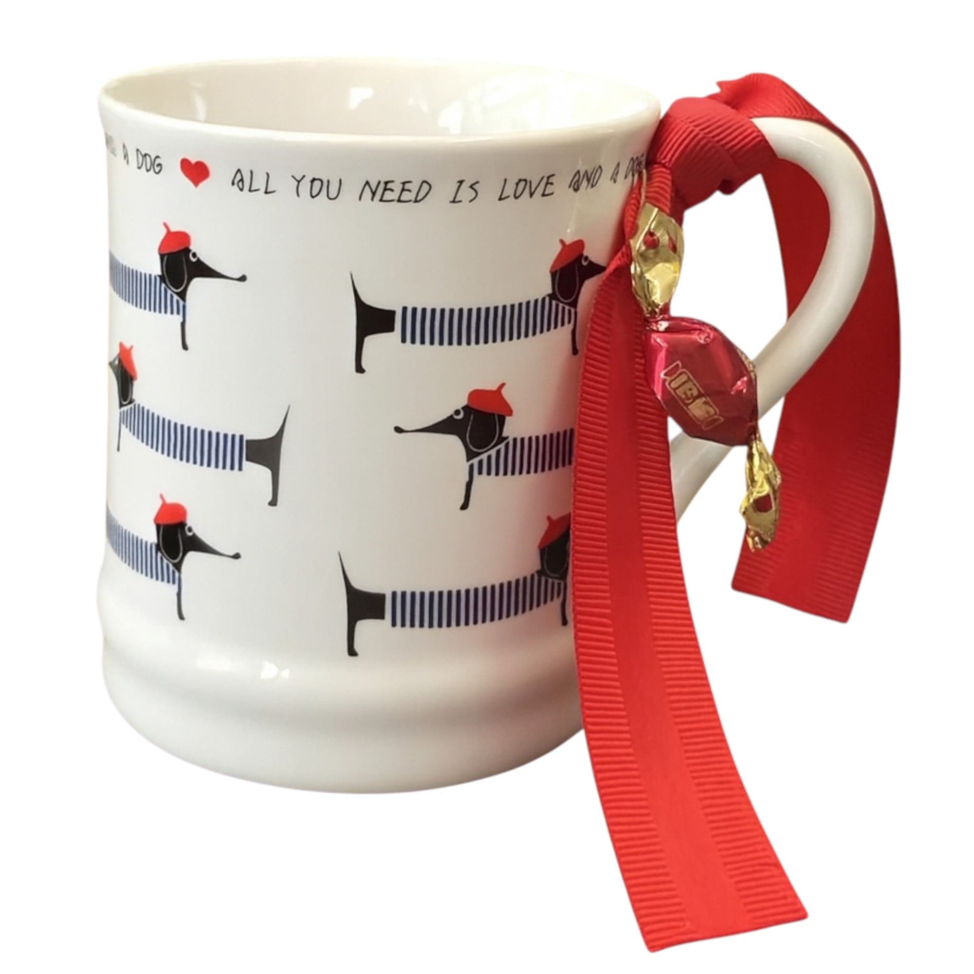 Χαριτωμένη κεραμική κούπα με παιχνιδιάρικο σχέδιο σκυλάκι-λουκάνικο και την τρυφερή φράση "All you need is love and a dog". Στο χερούλι είναι δεμένη κόκκινη κορδέλα με γιορτινό κερασματάκι – ιδανική για δώρο σε φιλόζωους, φίλους ή... στον εαυτό σας!