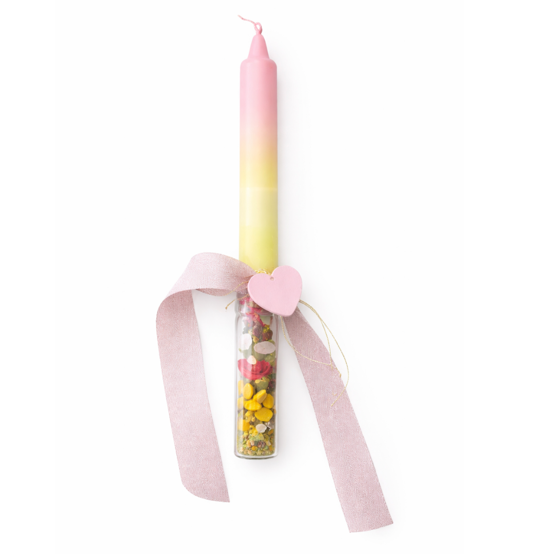 Μια ρομαντική και ιδιαίτερη πασχαλινή λαμπάδα σε απαλές αποχρώσεις ροζ και κίτρινου, που αποπνέει τρυφερότητα και φινέτσα. Διακοσμημένη με γυάλινο φιαλίδιο γεμάτο με πολύχρωμα φυσικά στοιχεία και μια χαριτωμένη ροζ καρδιά, αποτελεί την ιδανική επιλογή για δώρο γεμάτο συναίσθημα.