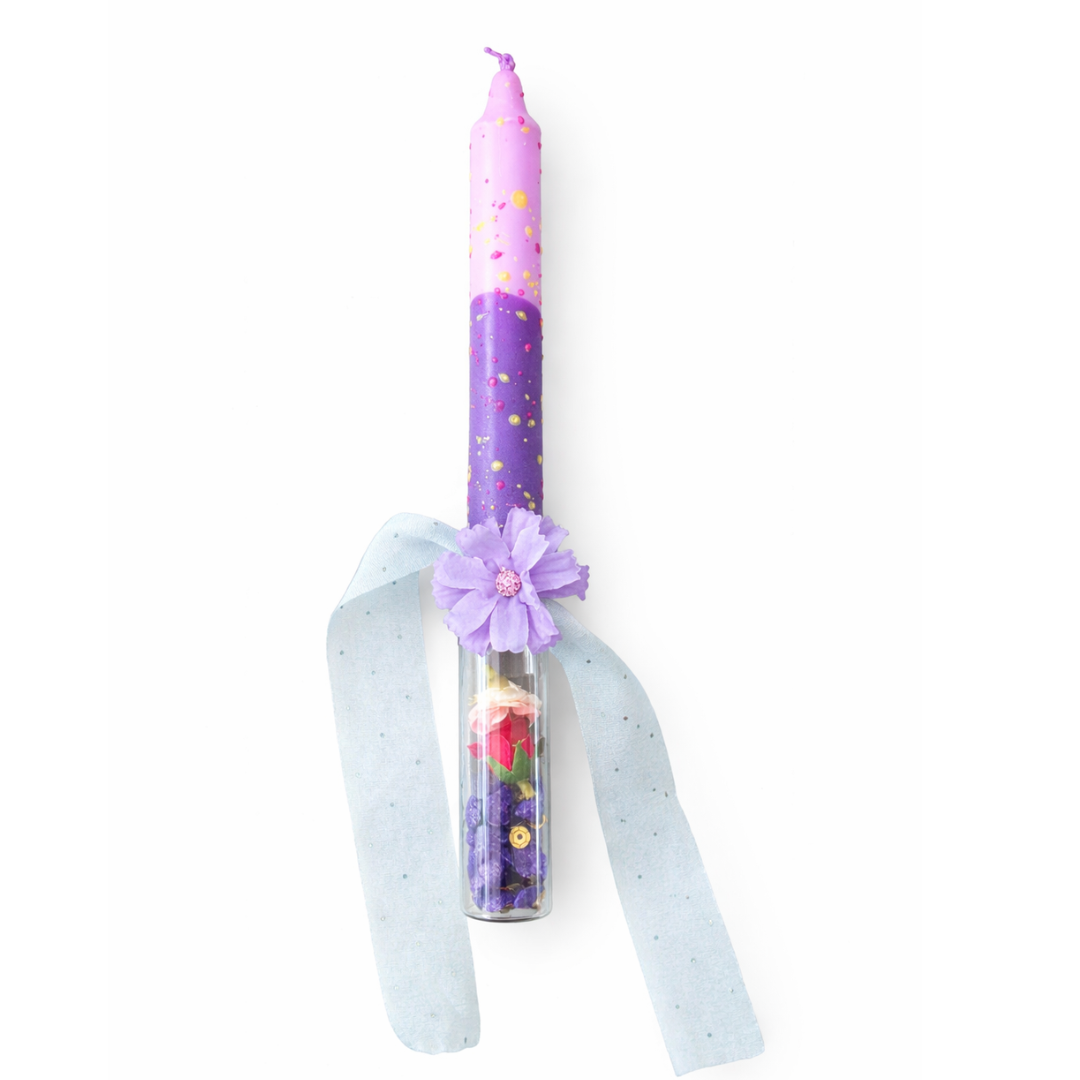 Μια κομψή και ανοιξιάτικη πασχαλινή λαμπάδα σε αποχρώσεις ροζ και μωβ, διακοσμημένη με παιχνιδιάρικες πιτσιλιές χρώματος που χαρίζουν ζωντάνια και μοναδικότητα.