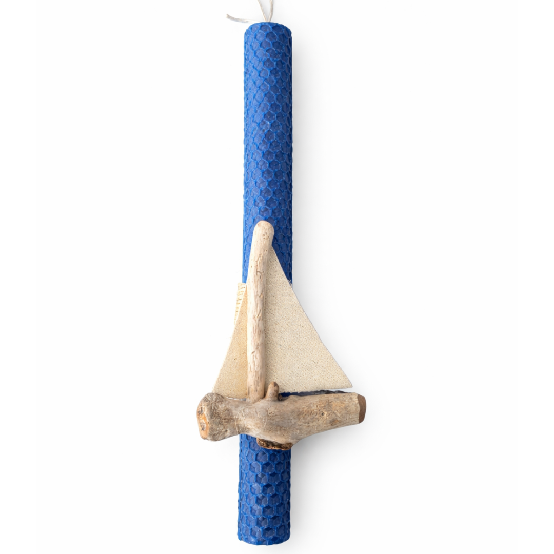 Μια ξεχωριστή πασχαλινή λαμπάδα από φυσική κερήθρα σε βαθύ μπλε χρώμα, που συνδυάζει αυθεντικότητα και καλοκαιρινή αισθητική.