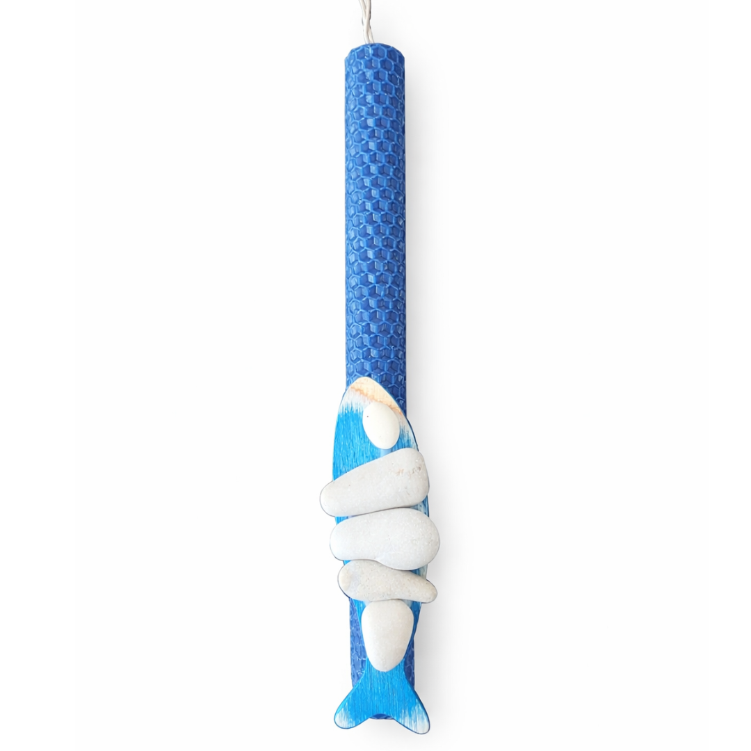 Μια ιδιαίτερη πασχαλινή λαμπάδα από φυσική κερήθρα σε βαθύ μπλε χρώμα, εμπνευσμένη από τη θάλασσα και την ελληνική νησιώτικη αισθητική.