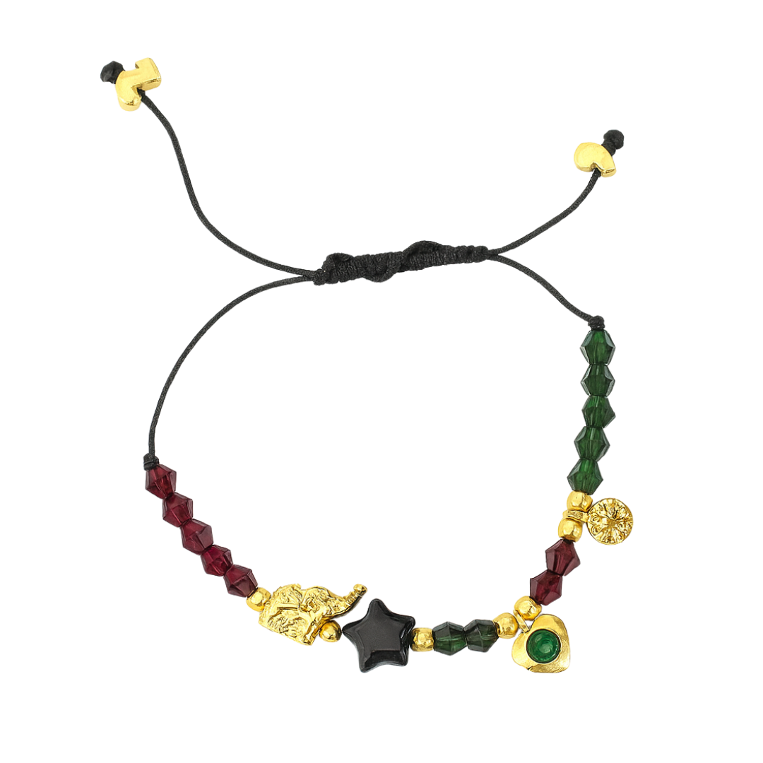 Αποτελείται από κρυσταλλάκια σε αποχρώσεις βαθυκόκκινου και πράσινου, μαύρο κεντρικό αστεράκι, και χρυσές μεταλλικές λεπτομέρειες που περιλαμβάνουν ελεφαντάκι τύχης, καρδιά με πράσινη πέτρα και μικρό χρυσό charm.