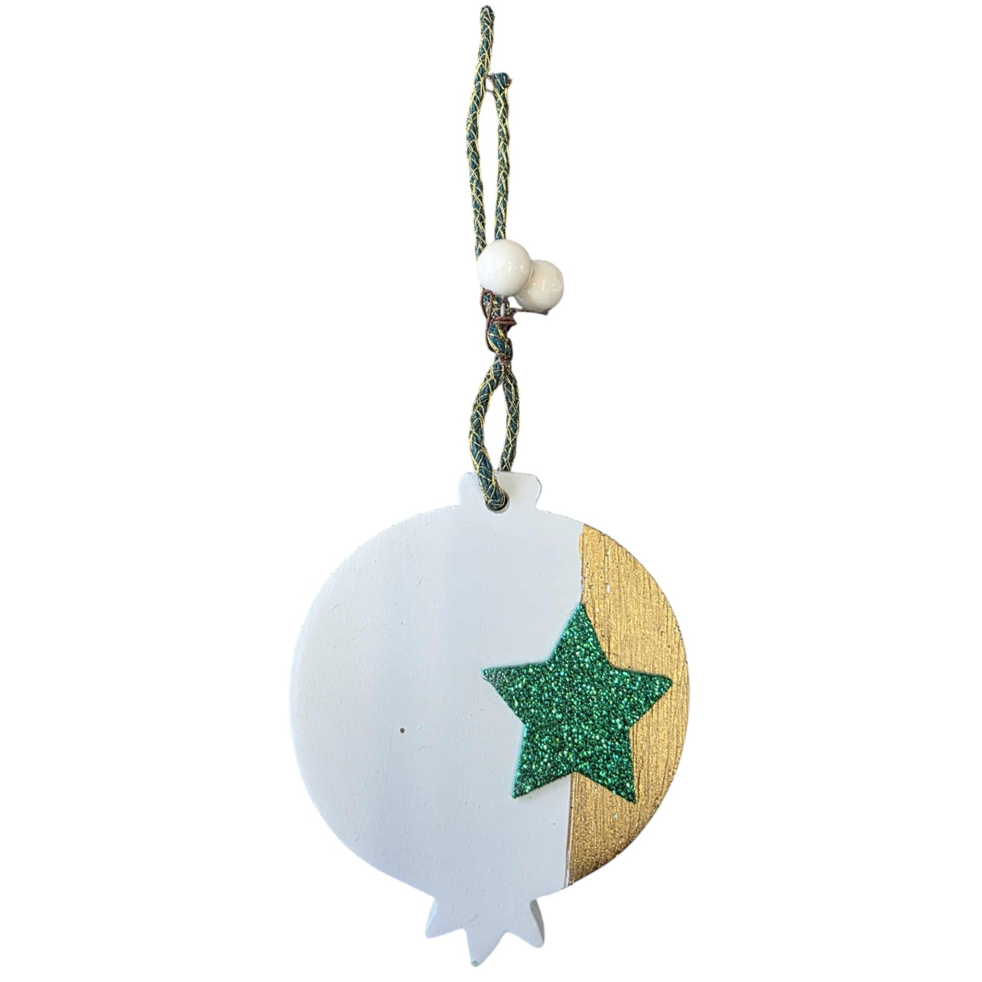 Χειροποίητο ρόδι από αρωματικό γύψο, με χρυσή λεπτομέρεια και πράσινο glitter αστέρι. Συνοδεύεται από διακοσμητικό κορδόνι και περλάκια. Ένα συμβολικό στολίδι για καλοτυχία και γιορτινή λάμψη, ιδανικό για το δέντρο ή για να το χαρίσετε!