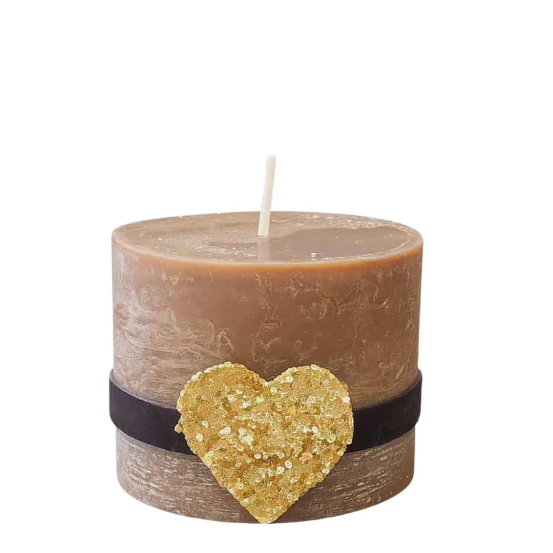 Μοντέρνο κερί σε γήινη καφέ απόχρωση, διακοσμημένο με μαύρη κορδέλα και εντυπωσιακή καρδιά από χρυσά γκλίτερ. Μια λιτή αλλά κομψή επιλογή για ρομαντική διακόσμηση, δώρο αγάπης ή προσθήκη στο γιορτινό σου τραπέζι.