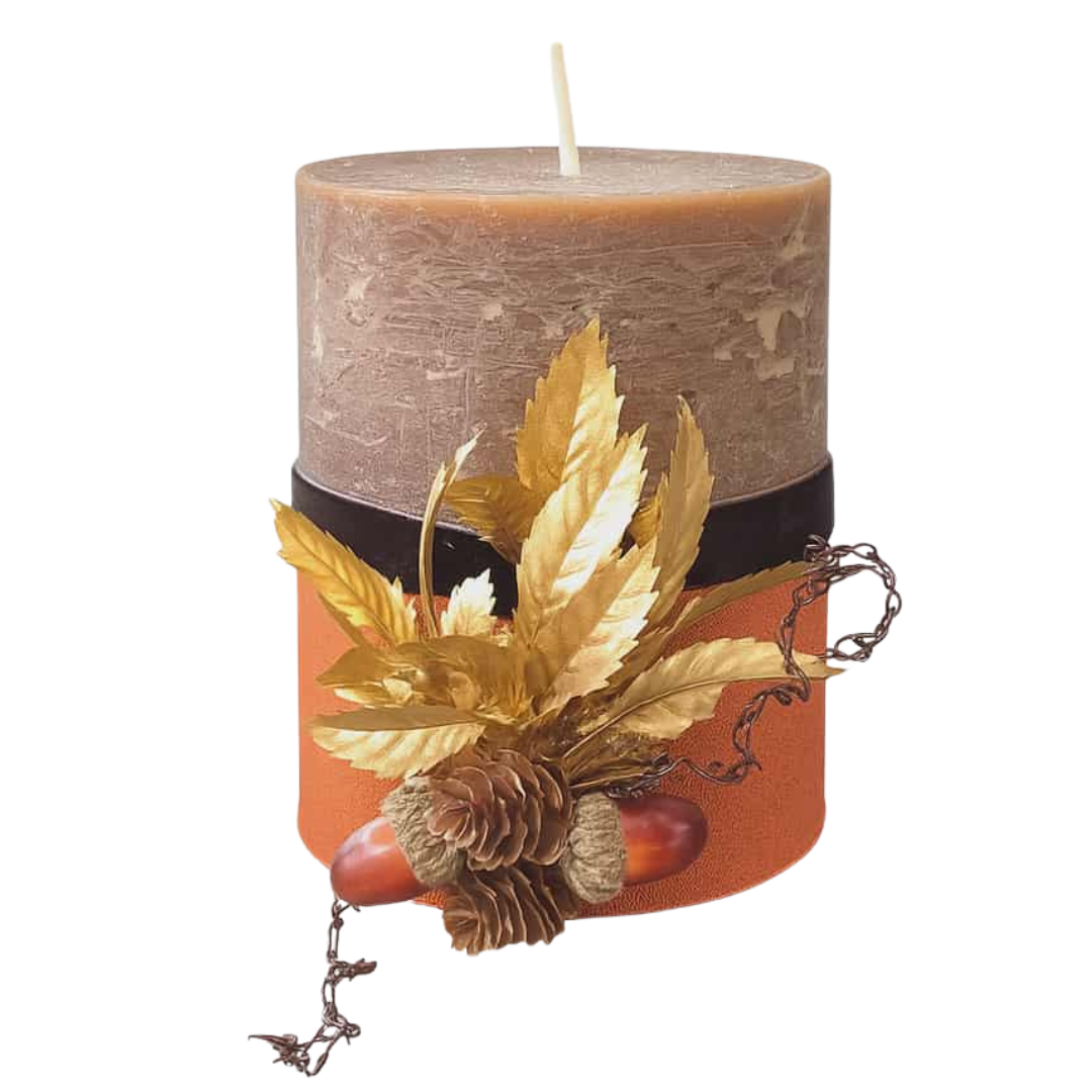 Χειροποίητο κερί σε φυσική απόχρωση, διακοσμημένο με εντυπωσιακή σύνθεση από χρυσά φύλλα, κουκουνάρια και βελανίδια. Η βάση του τυλίγεται με ύφασμα σε ζεστό πορτοκαλί-τερακότα, αποπνέοντας θαλπωρή και στυλ.