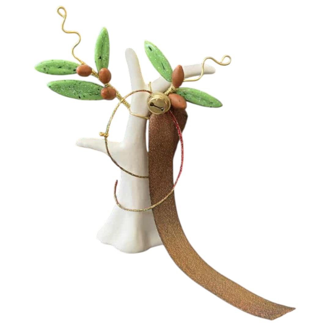 Ένα καλαίσθητο γούρι με έμπνευση από την ελιά — το διαχρονικό ελληνικό σύμβολο ειρήνης, σοφίας και γονιμότητας. Το κλαδί με φύλλα και καρπούς ελιάς είναι χειροποίητο από κεραμικό και μέταλλο, στερεωμένο σε μια λιτή, λευκή κεραμική βάση σε σχήμα χεριού. Η χρυσή καμπανούλα και η σατινέ κορδέλα ολοκληρώνουν το καλοδουλεμένο αυτό διακοσμητικό.