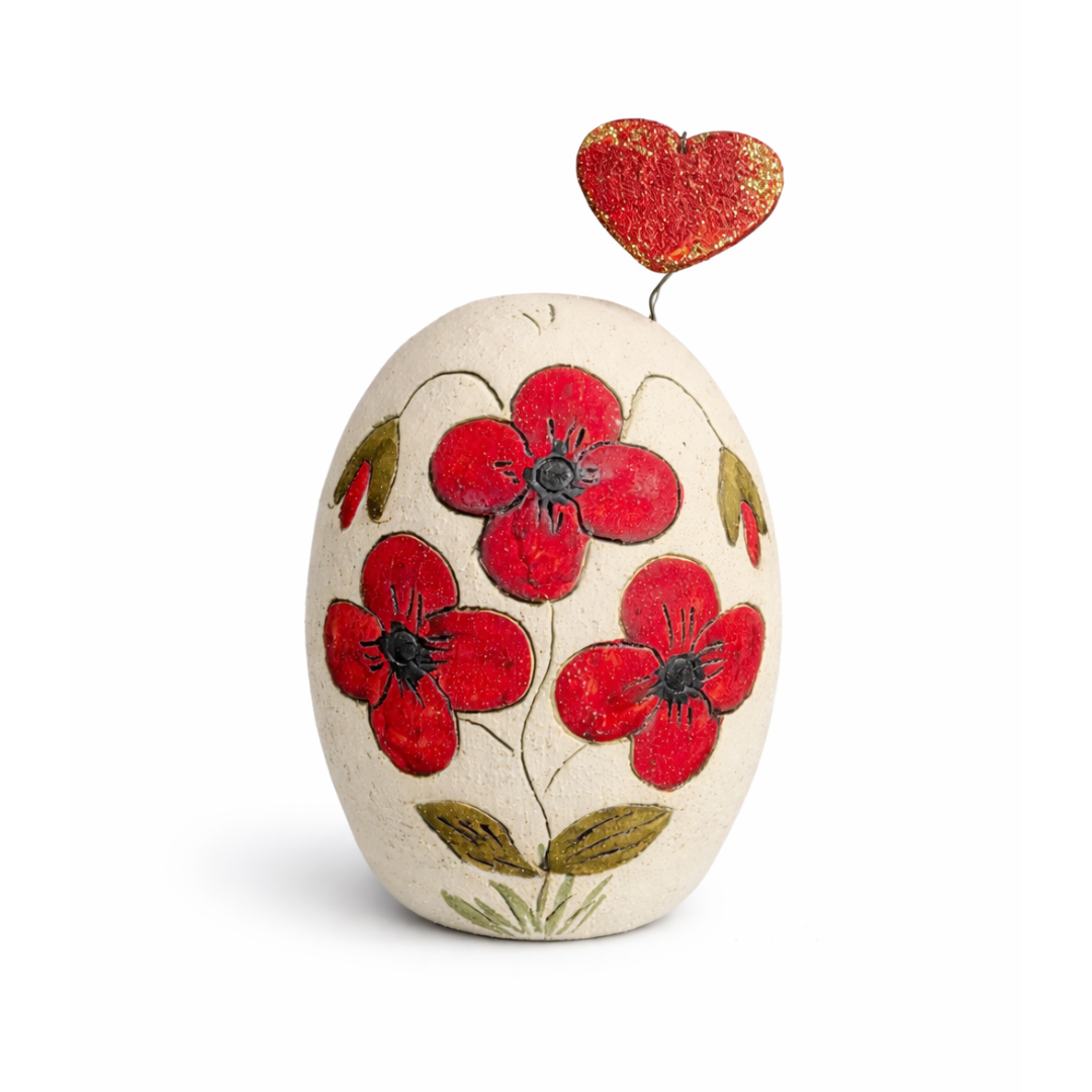 Ένα ιδιαίτερο πασχαλινό διακοσμητικό αυγό με ζωγραφισμένα κόκκινα λουλούδια και χειροποίητη αισθητική.