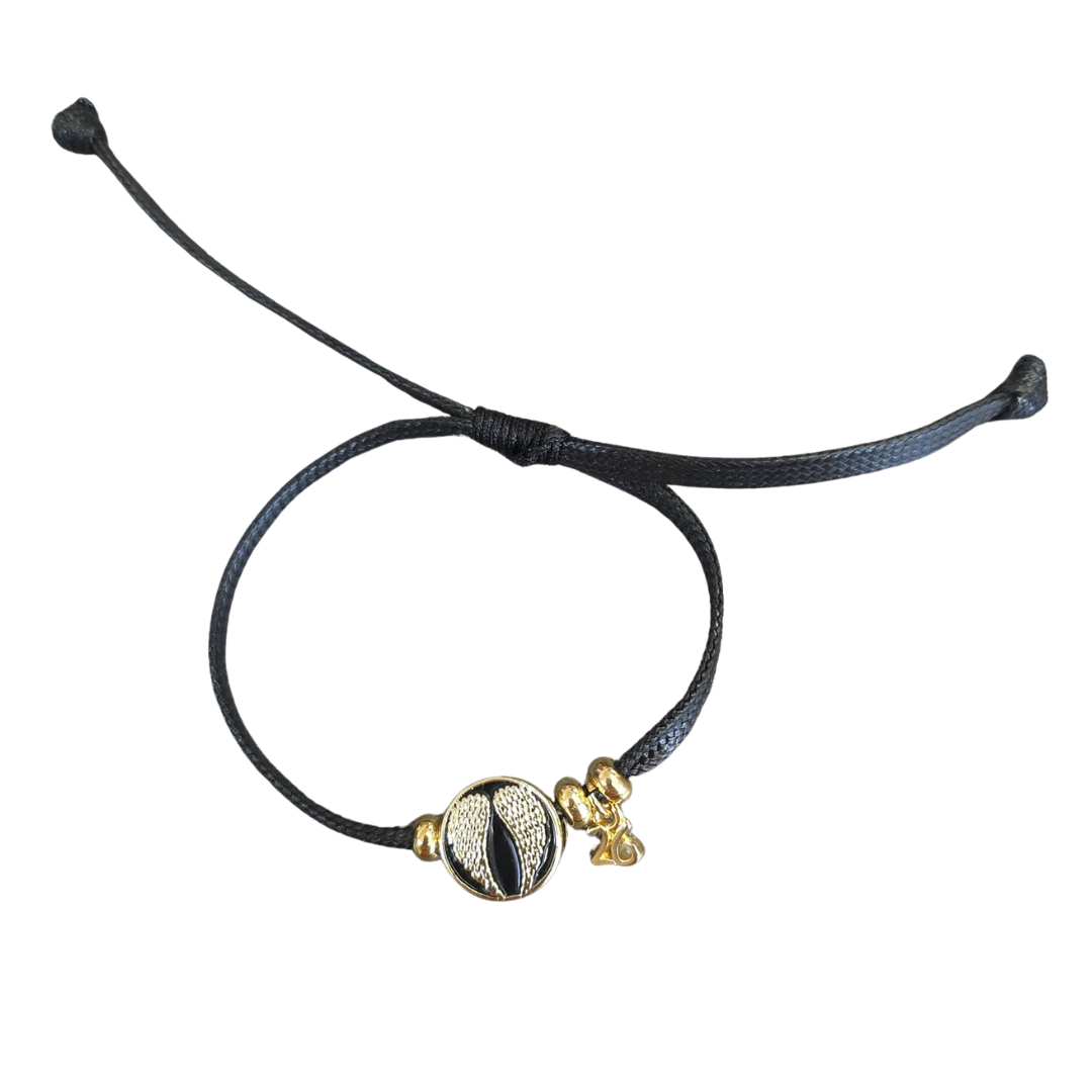 Το βραχιόλι διαθέτει ανθεκτικό κορδόνι και κεντρικό μεταλλικό στοιχείο σε σχήμα φτερών, με λεπτή σφυρήλατη υφή που χαρίζει λάμψη και κομψότητα.