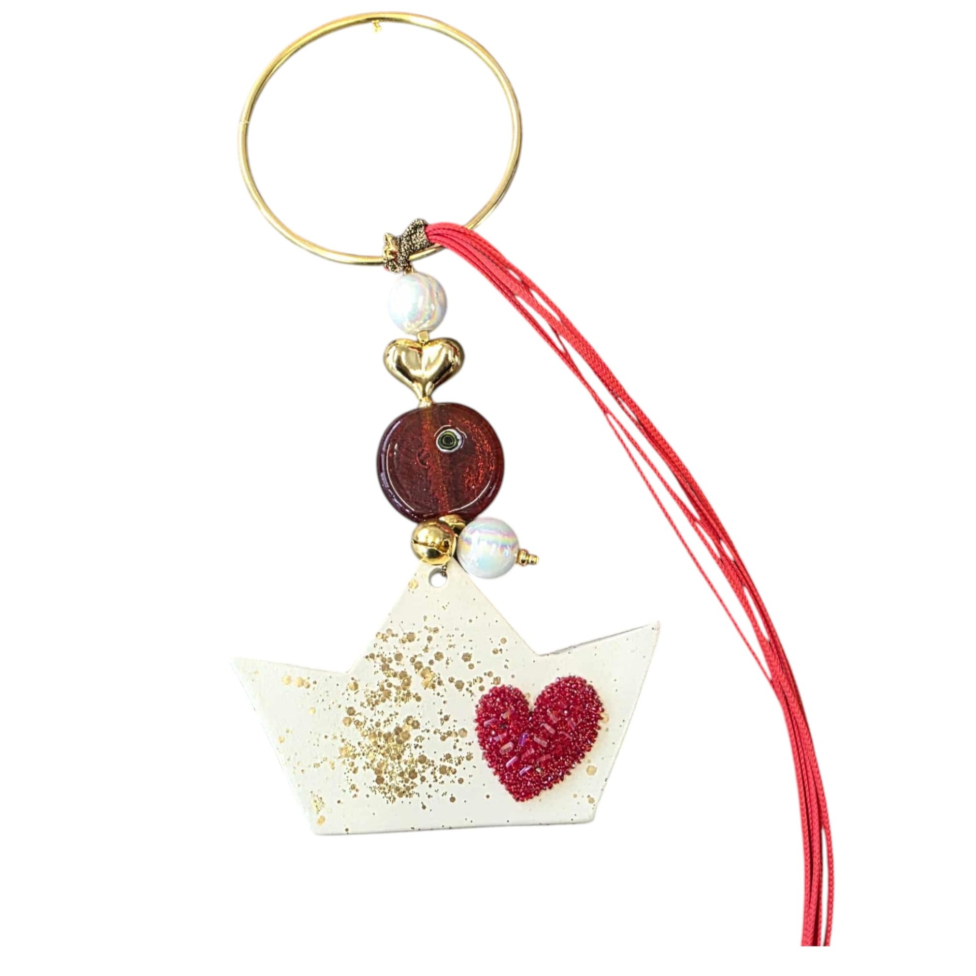 Χειροποίητο καραβάκι από γύψο σε σχήμα χαρτοκαραβιού, με χρυσές πιτσιλιές και κόκκινη καρδιά με glitter, διακοσμημένο με χάντρες, μεταλλική καρδούλα και κόκκινο κορδόνι. Ένα στολίδι–ευχή για έναν χρόνο γεμάτο συναισθήματα, τύχη και όμορφες διαδρομές!