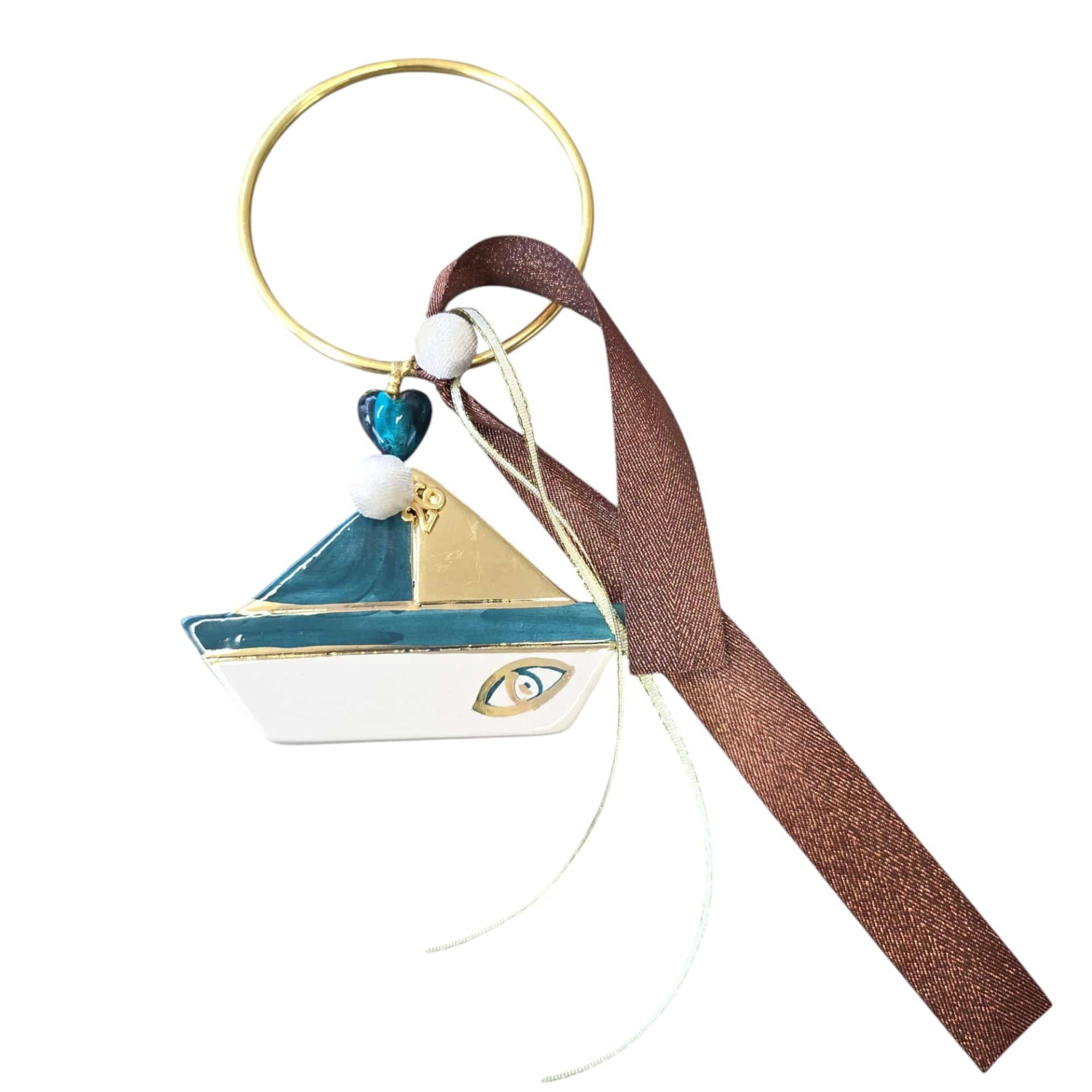 Χειροποίητο κεραμικό καραβάκι με χρυσές λεπτομέρειες 24Κ, διακοσμημένο με καρδιά μουράνο, χάντρες, φιόγκο και αρωματικό γύψο, σε υπέροχη ναυτική παλέτα με τιρκουάζ και λευκό.