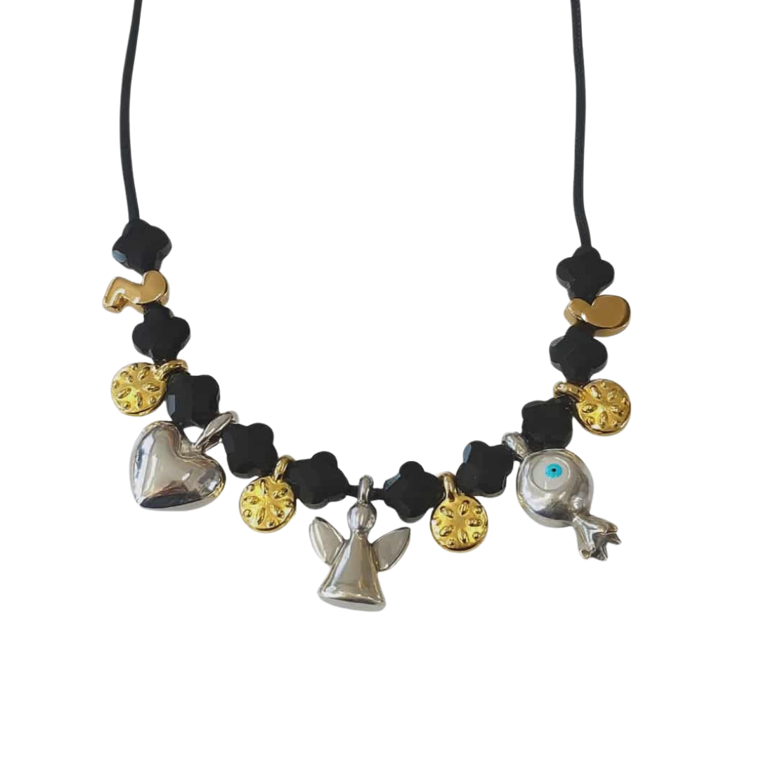 Αναδείξτε το στυλ σας με αυτό το μοναδικό κολιέ με μαύρες χάντρες και γούρια σε ασημί και χρυσούς τόνους. Η σύνθεση περιλαμβάνει καρδιά, άγγελο, ματάκι και στρογγυλά χρυσά στοιχεία, δημιουργώντας ένα κομψό και ταυτόχρονα παιχνιδιάρικο κόσμημα που φοριέται όλες τις ώρες. Ιδανικό ως δώρο αλλά και για να συμπληρώσει κάθε καθημερινό ή βραδινό outfit. Ρυθμιζόμενο κορδόνι για τέλεια εφαρμογή.