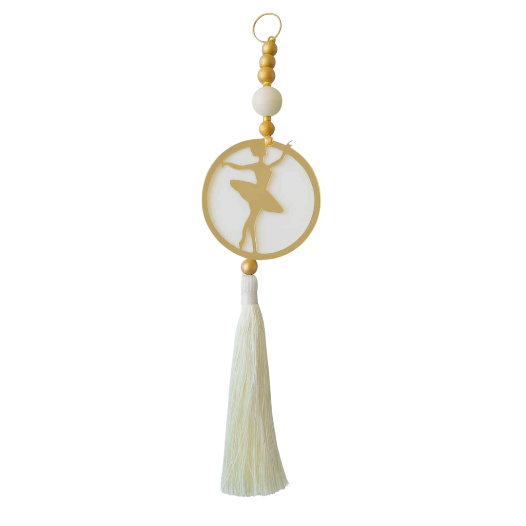 Το σχέδιο της μπαλαρίνας μέσα σε χρυσό κύκλο αποπνέει αρμονία και κίνηση, ενώ η πολυτελής χειροποίητη φούντα και οι γήινες χάντρες προσθέτουν μια ζεστή, μοντέρνα αισθητική.