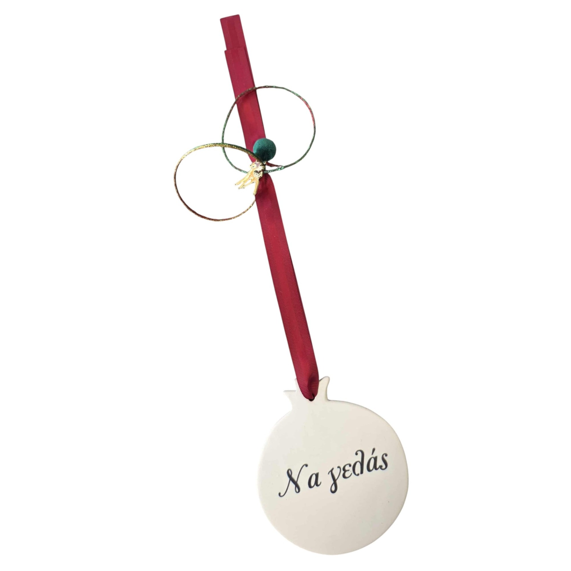 Κεραμικό ρόδι με ελληνική ευχή, δεμένο με κόκκινη κορδέλα και πράσινη λεπτομέρεια. Ένα δώρο καρδιάς για φίλους, συναδέλφους ή τον εαυτό σου!