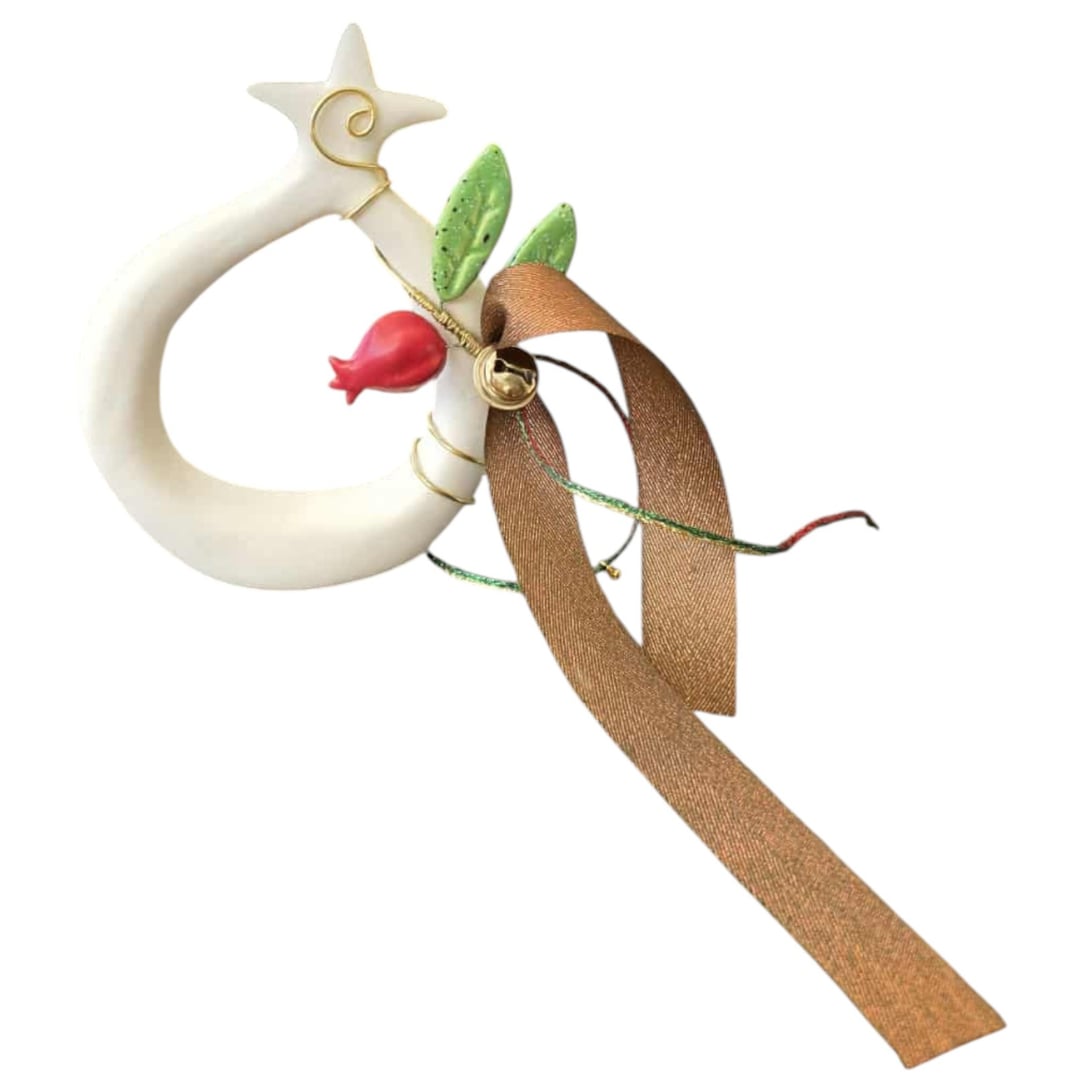 Ένα κομψό και συμβολικό γούρι με κεραμική βάση σε σχήμα ροδιού, διακοσμημένο με χειροποίητα στοιχεία: φύλλα, καμπανούλα και χρυσές λεπτομέρειες. Η σατινέ κορδέλα δίνει πολυτέλεια, ενώ το ρόδι φέρνει τύχη, ευημερία και αφθονία στο νέο έτος.