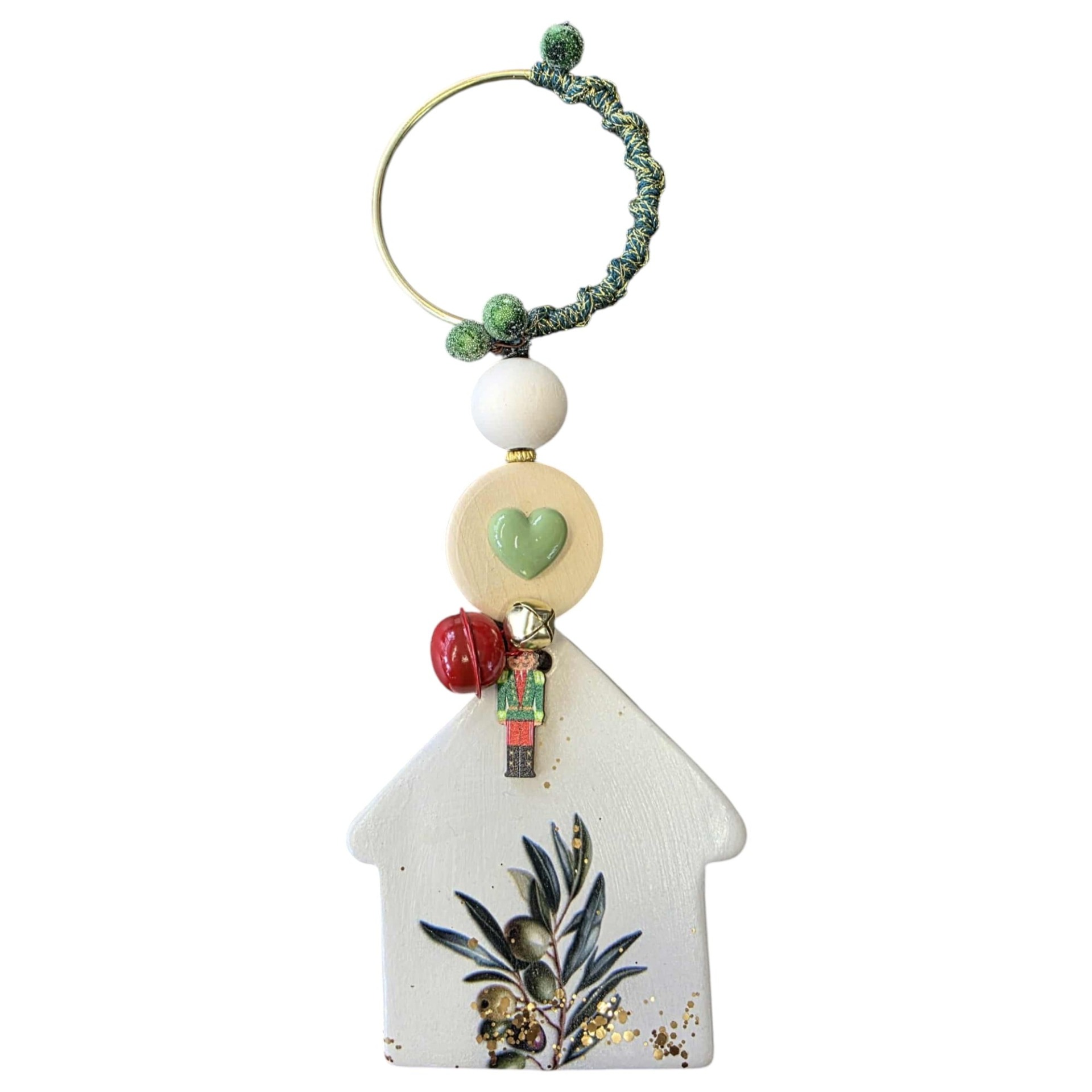Χειροποίητο σπιτάκι με ζωγραφιστό κλαδί ελιάς, ξύλινες χάντρες, πράσινη καρδιά και λεπτομέρειες με καμπανάκι και μπαλίτσα. Ιδανικό για να χαρίσετε ευχές ευτυχίας, αγάπης και αφθονίας στο σπίτι που θα το φιλοξενήσει.