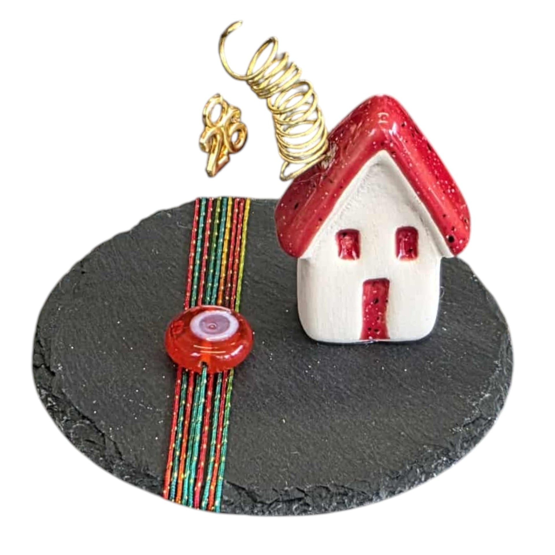 Χειροποίητο διακοσμητικό γούρι με σπιτάκι σε βάση από φυσική μαύρη πέτρα, διακοσμημένο με χρυσό μεταλλικό σπιράλ, πολύχρωμες κορδέλες και γυάλινο ματάκι. Ιδανικό για την προστασία του σπιτιού και την υποδοχή της νέας χρονιάς με τύχη, θαλπωρή και θετική ενέργεια.