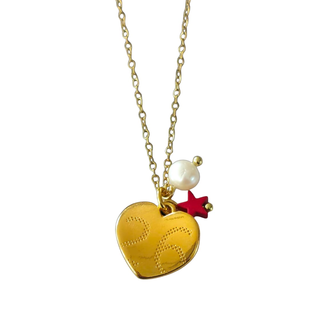 Κομψό κολιέ με ατσάλινη αλυσίδα υψηλής αντοχής και εντυπωσιακό μενταγιόν σε σχήμα καρδιάς από ορείχαλκο, με ανάγλυφο το νούμερο 26. Συνοδεύεται από λαμπερό λευκό μαργαριταράκι και ένα χαριτωμένο κόκκινο αστεράκι, δημιουργώντας έναν συνδυασμό που αποπνέει θηλυκότητα, ζωντάνια και γιορτινή διάθεση.