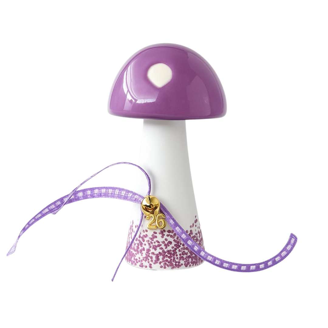 Κομψό διακοσμητικό κεραμικό μανιτάρι σε αποχρώσεις λευκού και έντονου μωβ, με γυαλιστερή επιφάνεια στο καπέλο και λεπτομέρειες από μοβ πιτσιλιές στη βάση. Διακοσμημένο με χρυσό μεταλλικό στοιχείο "26" και μωβ κορδέλα, προσθέτει μια παιχνιδιάρικη αλλά elegant πινελιά σε κάθε χώρο. Ιδανικό για δώρο, για χριστουγεννιάτικη διακόσμηση ή ως statement κομμάτι σε ράφι ή τραπέζι.