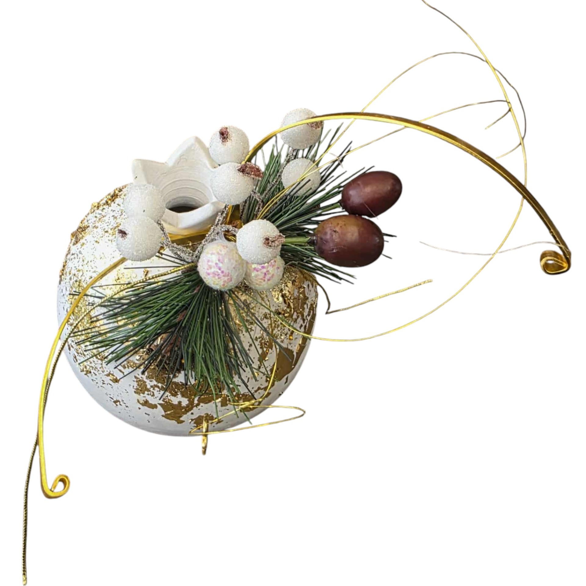 Ένα εντυπωσιακό χειροποίητο κεραμικό ρόδι σε λευκή βάση, διακοσμημένο με φύλλα χρυσού και γκλίτερ για μοναδική λάμψη! Στολισμένο με φυσικές λεπτομέρειες από κουκουνάρια, καρπούς, πευκοβελόνες και μεταλλικά στοιχεία που δημιουργούν κομψό και γιορτινό αποτέλεσμα.