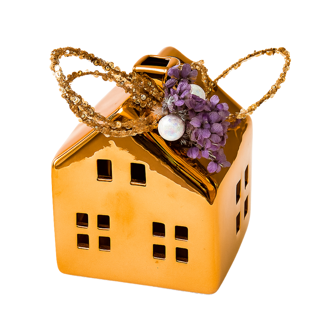 Ένα εκλεπτυσμένο διακοσμητικό κεραμικό σπιτάκι σε μπρονζέ ροζ-χρυσό χρώμα, που συνδυάζει λάμψη και ρομαντισμό. Διαθέτει χώρο για ρεσώ ή led κεράκι και δημιουργεί μια ζεστή, γιορτινή ατμόσφαιρα.