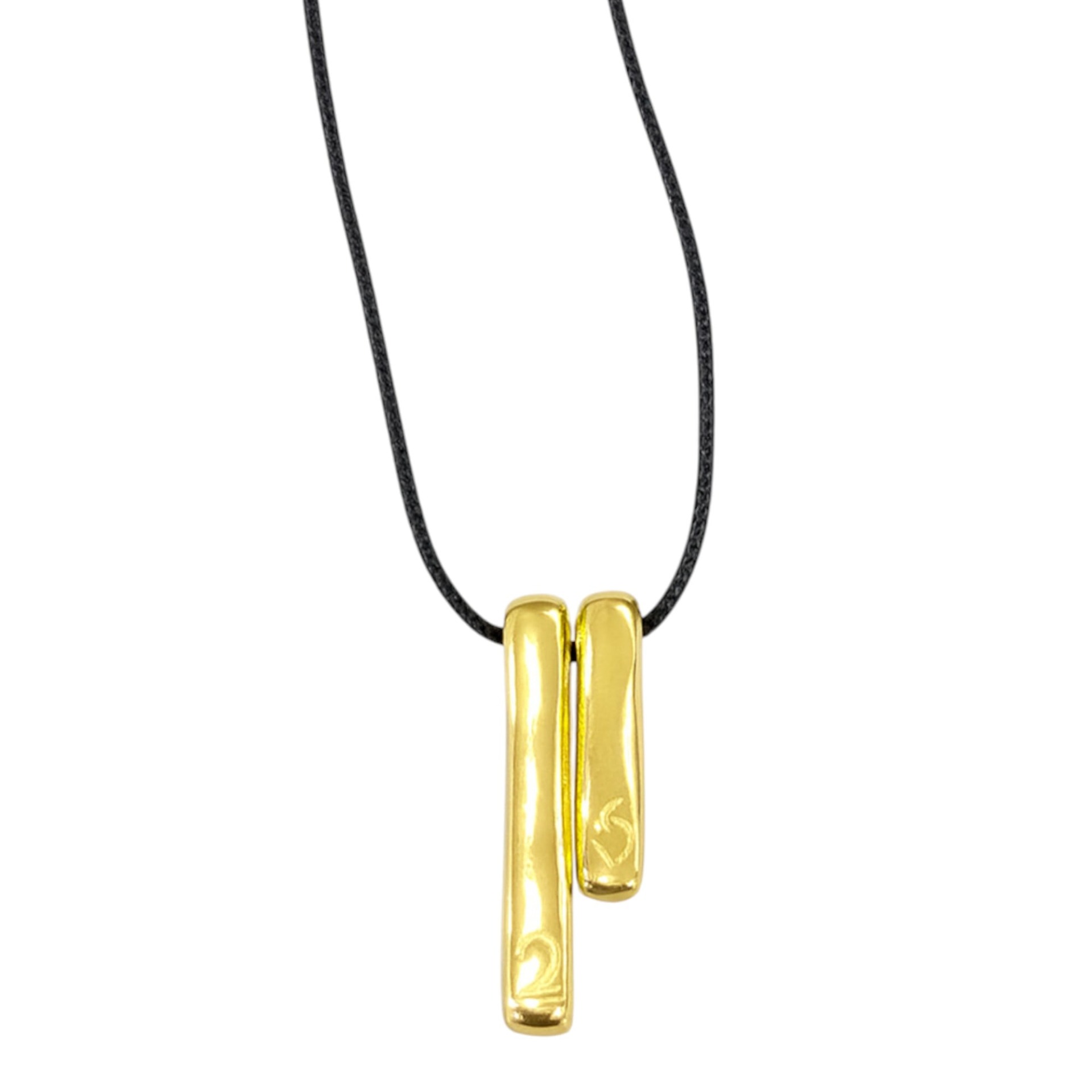Μοντέρνο και συμβολικό κολιέ με δύο χρυσά μεταλλικά μοτίφ σε κάθετη διάταξη, χαραγμένα με το 2 και το 6, δεμένα σε μαύρο κορδόνι. Minimal, unisex και ιδανικό για να σηματοδοτήσει τη νέα χρονιά με στυλ.