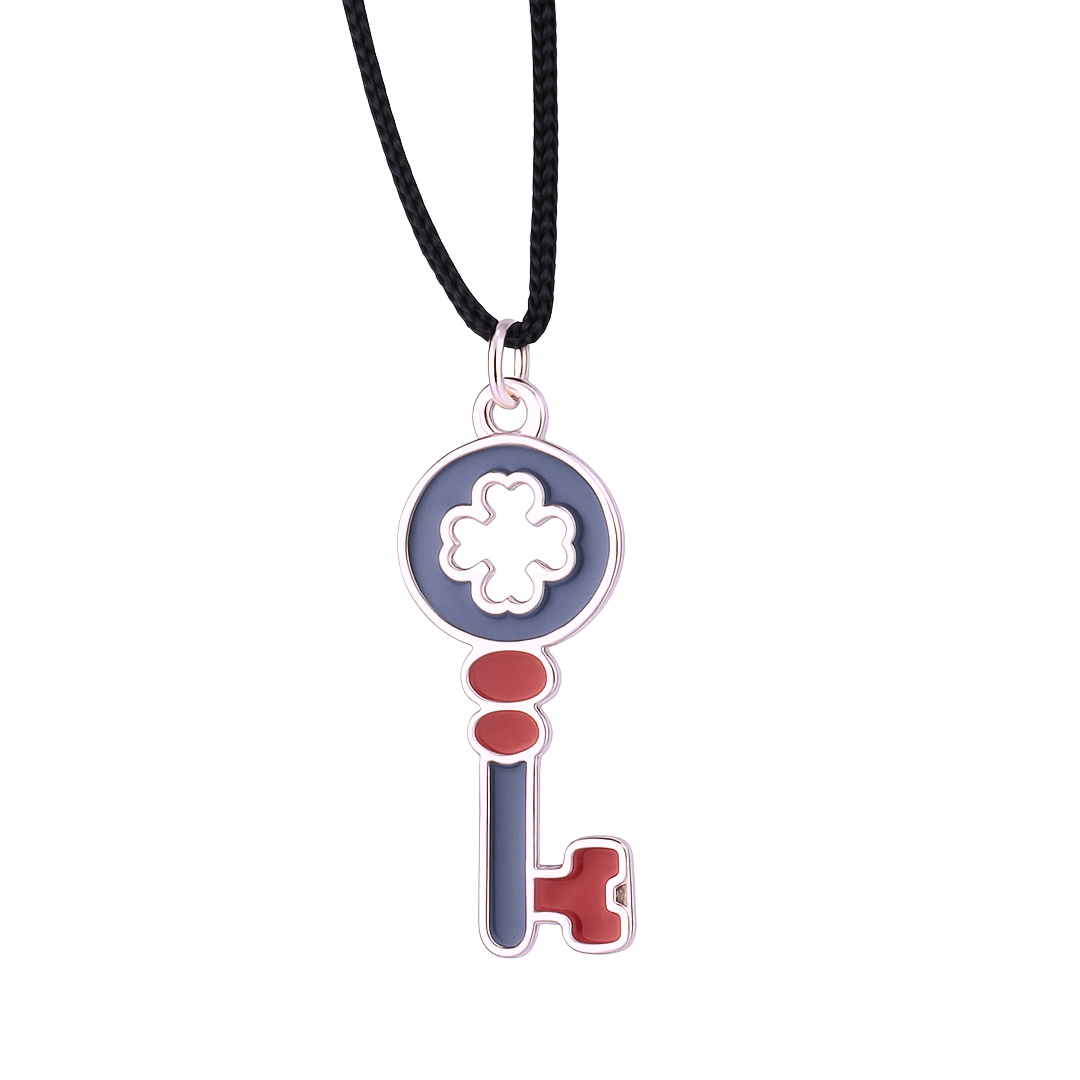Το μενταγιόν έχει σχήμα κλειδιού τύχης, με περίγραμμα σε ασημί χρώμα και χρωματιστές λεπτομέρειες σε μπλε και κόκκινο σμάλτο. Κρέμεται από μαύρο, ανθεκτικό κορδόνι που προσαρμόζεται εύκολα στο μήκος που επιθυμείτε.