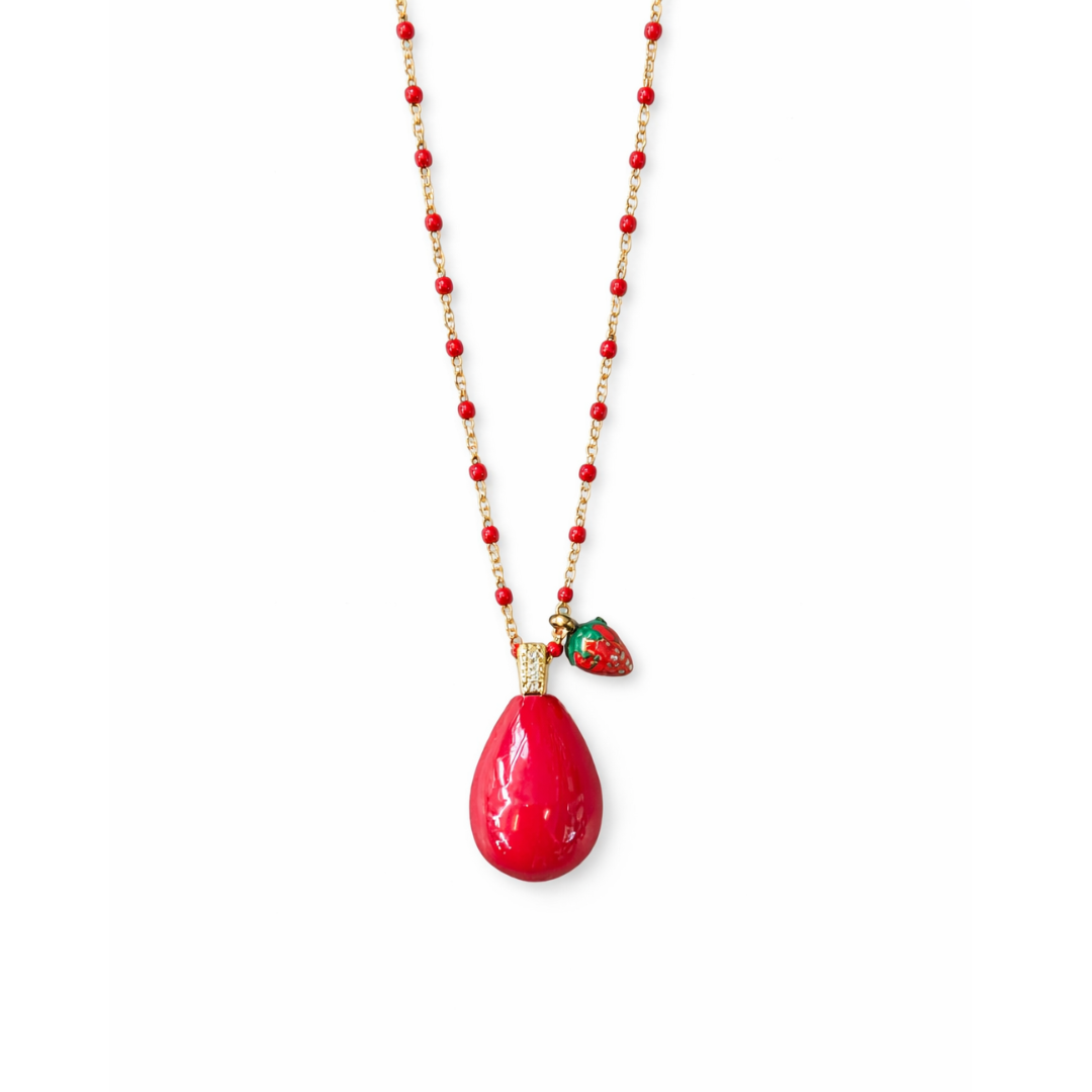 Κομψό και παιχνιδιάρικο κολιέ με κόκκινο αυγό και διακριτική φραουλίτσα, δεμένο σε ατσάλινη αλυσίδα με κόκκινες λεπτομέρειες.