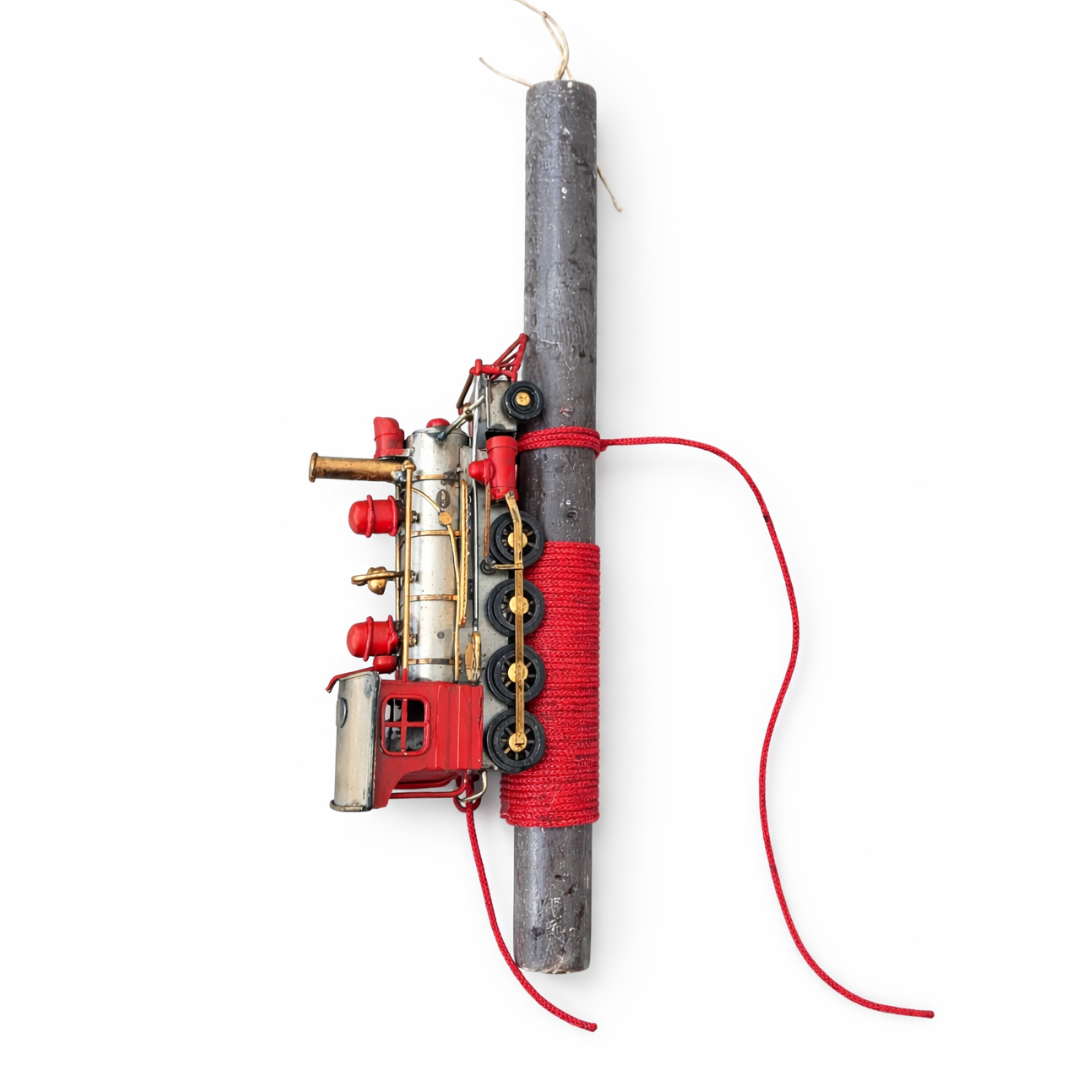 Οι vintage λεπτομέρειες του τρένου σε μεταλλικές και κόκκινες αποχρώσεις δημιουργούν ένα δυναμικό και ξεχωριστό αποτέλεσμα. Το κόκκινο κορδόνι δίνει ένταση και χαρακτήρα, καθιστώντας τη λαμπάδα ιδανική για όσους αγαπούν τα κλασικά και μηχανικά αντικείμενα.