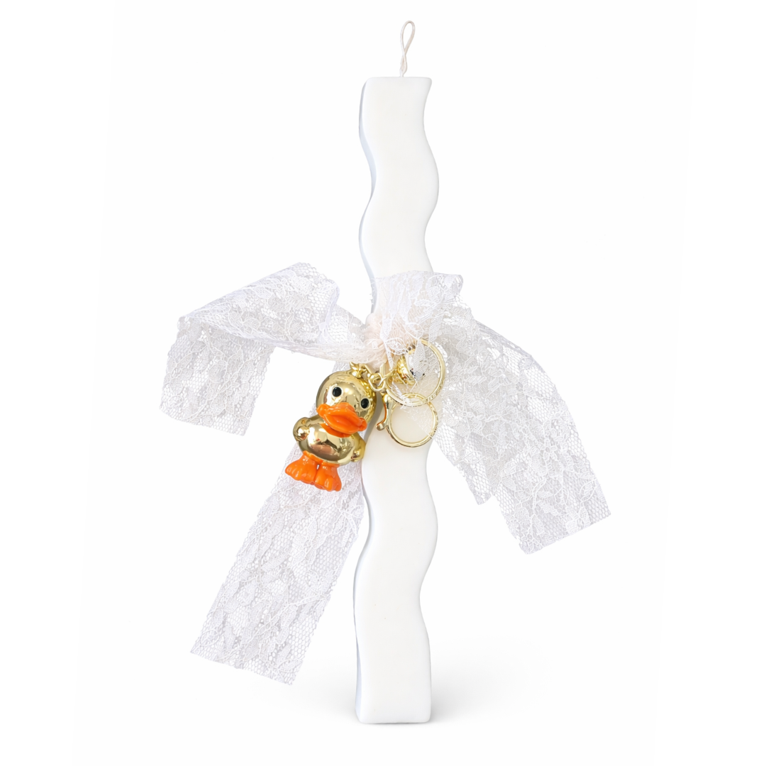 Χαριτωμένη και παιχνιδιάρικη αρωματική λαμπάδα σε minimal γραμμή, διακοσμημένη με εντυπωσιακό μπρελόκ παπάκι σε χρυσή και πορτοκαλί απόχρωση. Η κομψή δαντέλα προσθέτει μια ρομαντική πινελιά, δημιουργώντας έναν όμορφο συνδυασμό ανάμεσα στο cute και το elegant.