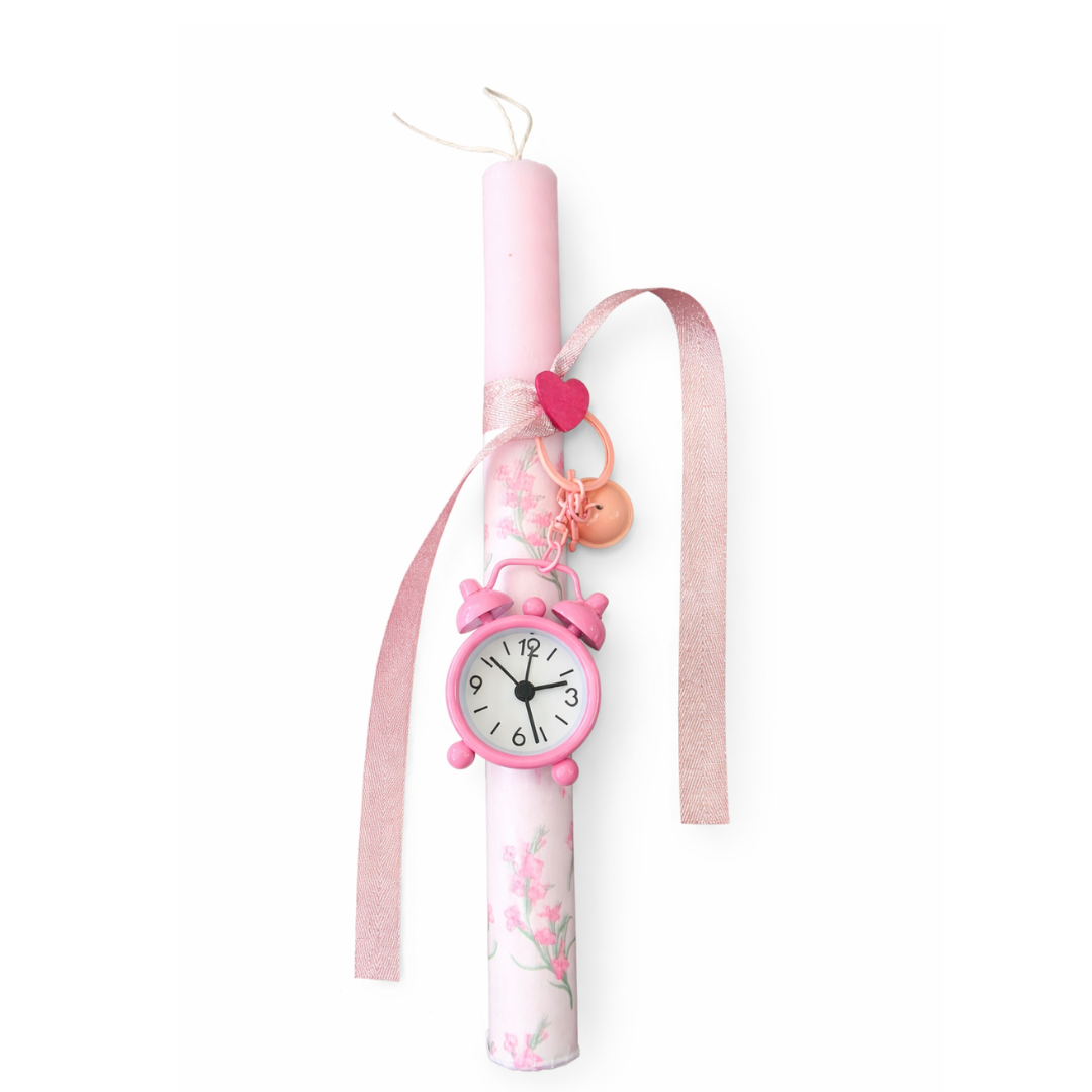 Μια ρομαντική και κομψή πασχαλινή λαμπάδα σε απαλές ροζ αποχρώσεις, διακοσμημένη με μπρελόκ ρολόι που χαρίζει μοναδικό χαρακτήρα.