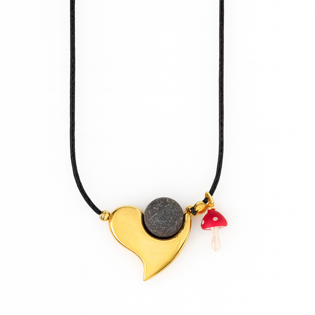 Κομψό χειροποίητο κολιέ με μαύρο κορδόνι και εντυπωσιακό κεντρικό στοιχείο μια μεταλλική χρυσή καρδιά σε καμπυλωτό design. Στο κέντρο της καρδιάς αγκαλιάζει μια ημιπολύτιμη πέτρα σε φυσική υφή, προσφέροντας ισορροπία ανάμεσα στη λάμψη και το γήινο στοιχείο. Το σύνολο συμπληρώνει ένα χαριτωμένο μεταλλικό μανιταράκι σε κόκκινο χρώμα, που λειτουργεί ως γούρι και προσθέτει playful αισθητική.