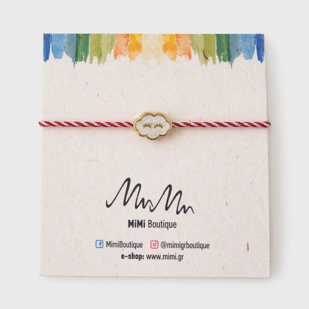Ένα κομψό και διαχρονικό μαρτάκι, φτιαγμένο με το παραδοσιακό κόκκινο-λευκό στριφτό κορδόνι που συμβολίζει την προστασία και την καλή τύχη. Στο κέντρο δεσπόζει ένα ιδιαίτερο στοιχείο σε σχήμα συννεφάκι με χρυσό περίγραμμα, που προσθέτει μία παιχνιδιάρικη αλλά και elegant πινελιά.