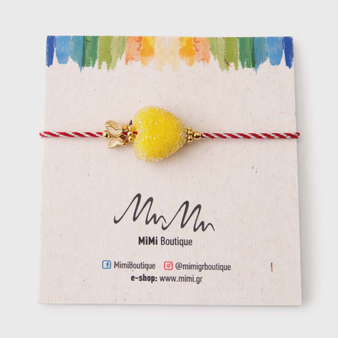 Ένα γλυκό και παιχνιδιάρικο μαρτάκι που θυμίζει… ζαχαρωτό! Το παραδοσιακό κόκκινο-λευκό κορδόνι συνδυάζεται με μία εντυπωσιακή καρδιά σε έντονη κίτρινη απόχρωση με υφή ζάχαρης, που δίνει μια μοναδική, "γλυκιά" αίσθηση στο κόσμημα. Τα χρυσά στοιχεία και ο μικρός φιόγκος προσθέτουν μια κομψή πινελιά και ολοκληρώνουν το σχέδιο.
