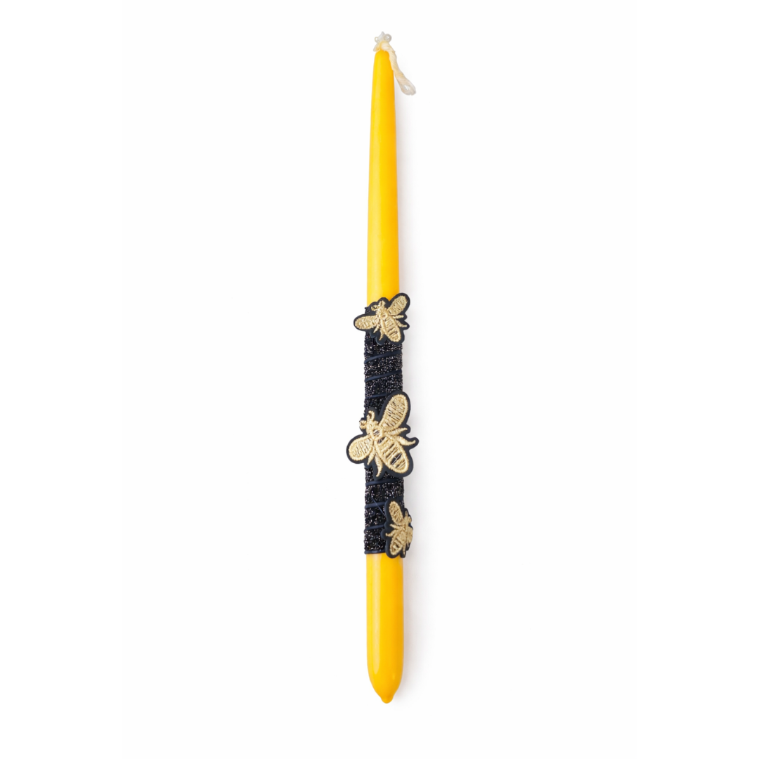 Χειροποίητη πασχαλινή λαμπάδα από φυσικό κερί μέλισσας, διακοσμημένη με κομψές μελισσούλες σε μαύρο και χρυσό.