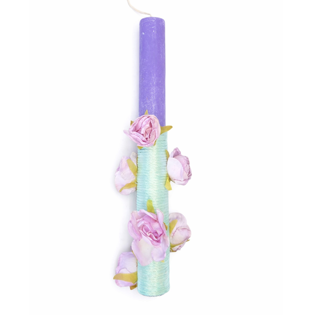 Χειροποίητη πασχαλινή λαμπάδα σε λιλά απόχρωση, διακοσμημένη με ρομαντικά χάρτινα λουλούδια σε απαλούς τόνους ροζ και παστέλ.