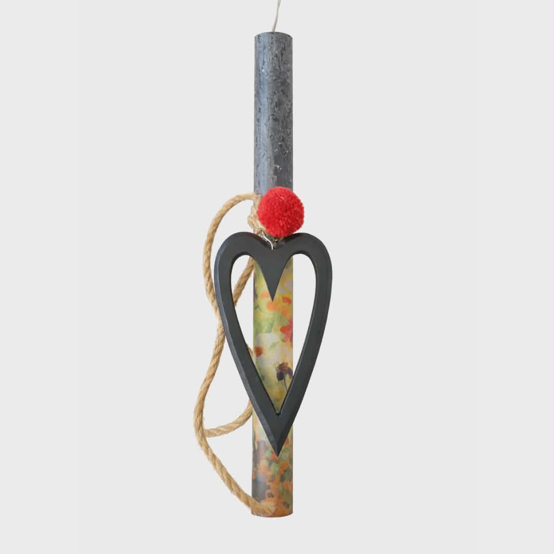 Minimal πασχαλινή λαμπάδα σε σκούρα γκρι απόχρωση, διακοσμημένη με ξύλινη καρδιά και φυσικό σχοινί.