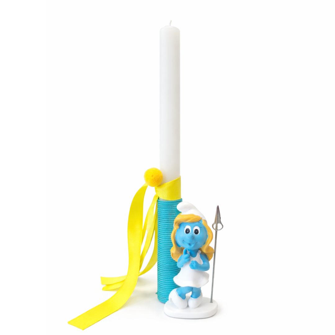 Χειροποίητη παιδική πασχαλινή λαμπάδα με τη χαριτωμένη Στρουμφίτα, συνοδευόμενη από πρακτική καρτοθήκη.