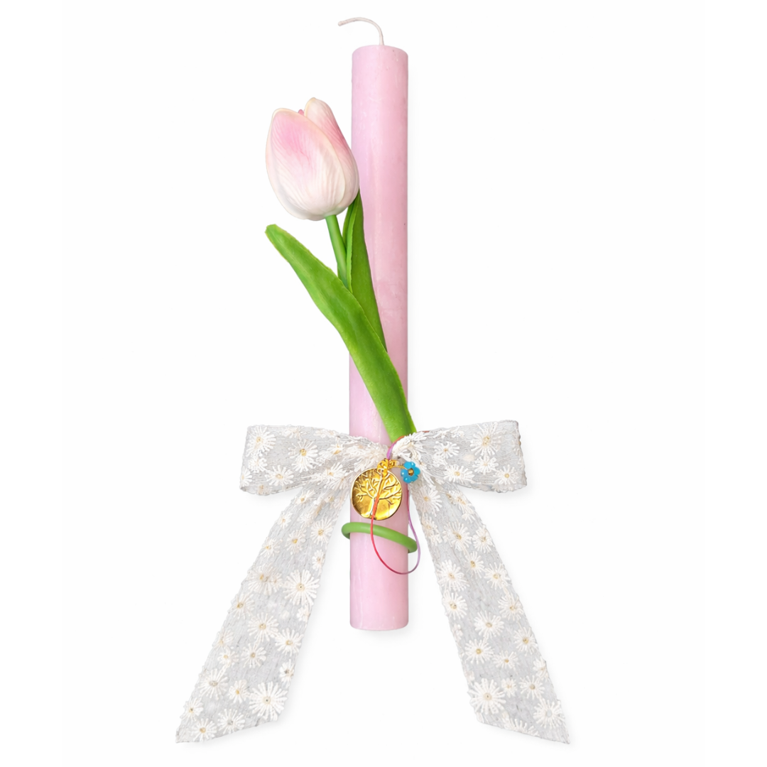 Ρομαντική χειροποίητη πασχαλινή λαμπάδα σε απαλή ροζ απόχρωση, διακοσμημένη με εντυπωσιακή διακοσμητική τουλίπα και κομψό μενταγιόν "Δέντρο της Ζωής".
