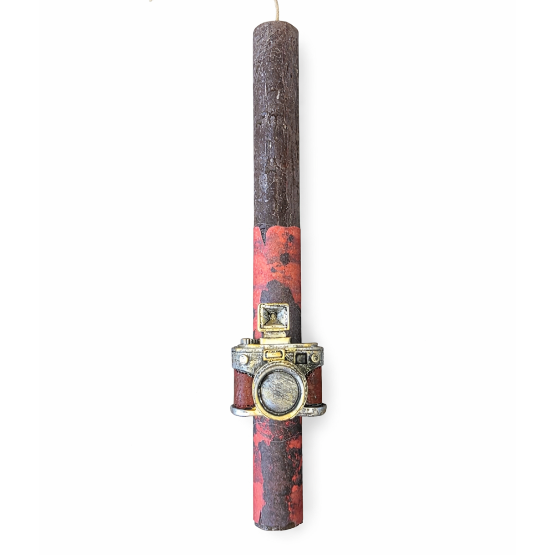 Χειροποίητη πασχαλινή λαμπάδα με μοναδικό vintage χαρακτήρα, διακοσμημένη με μεταλλική κάμερα σε ρετρό αισθητική. Ο συνδυασμός σκούρων αποχρώσεων με καλλιτεχνικές πινελιές δημιουργεί ένα ιδιαίτερο και κομψό αποτέλεσμα.
