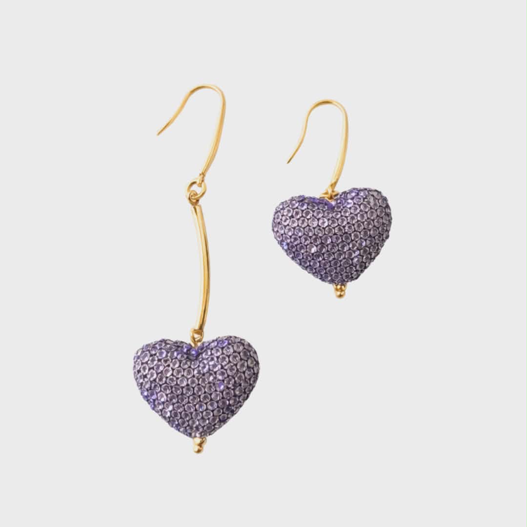 Εντυπωσιακά σκουλαρίκια σε σχήμα καρδιάς, διακοσμημένα με λαμπερά μωβ στρας που χαρίζουν μοναδική λάμψη σε κάθε σου εμφάνιση. Το χρυσό μεταλλικό στοιχείο αγκαλιάζει διακριτικά το σχέδιο, δημιουργώντας έναν κομψό συνδυασμό που ισορροπεί ανάμεσα στο ρομαντικό και το glam.
