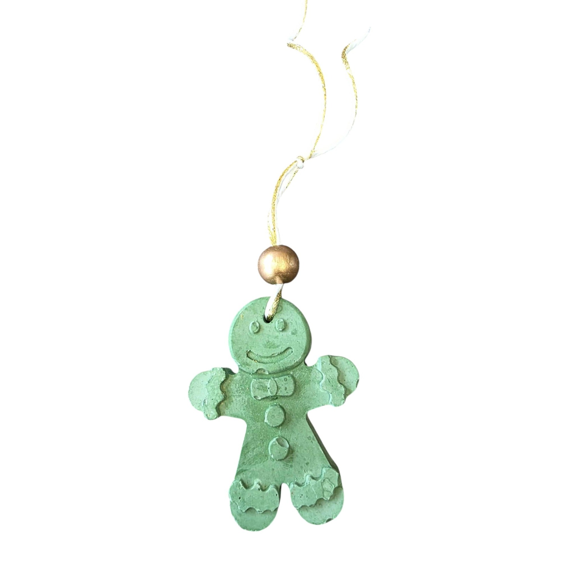 Γλυκιά χριστουγεννιάτικη πινελιά με άρωμα! Το χειροποίητο στολίδι σε σχήμα πράσινου gingerbread ανθρωπάκου είναι φτιαγμένο από αρωματικό γύψο και χαρίζει παιχνιδιάρικη διάθεση και διακριτικό άρωμα στον χώρο σας. Διακοσμημένο με χρυσή κορδελίτσα και ξύλινη χάντρα, είναι ιδανικό για το δέντρο, το σπίτι ή και ως ξεχωριστό δώρο.