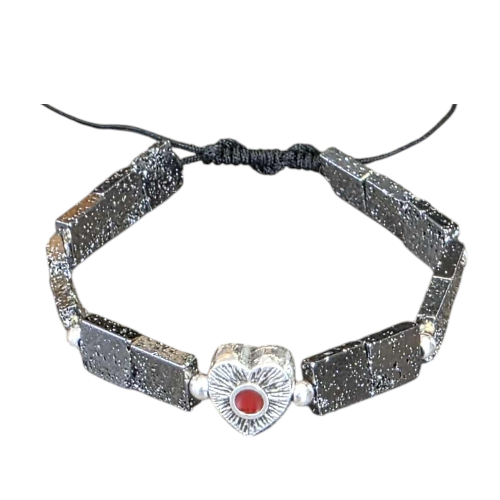 Χειροποίητο βραχιόλι με αιματίτες σε κυβικό σχήμα και μεταλλική καρδιά στο κέντρο με κόκκινη πέτρα, δεμένο με μακραμέ αυξομειούμενο κορδόνι. Ένα ιδιαίτερο, κομψό κόσμημα με γείωση και ενέργεια – ιδανικό για καθημερινή χρήση ή συμβολικό δώρο αγάπης.
